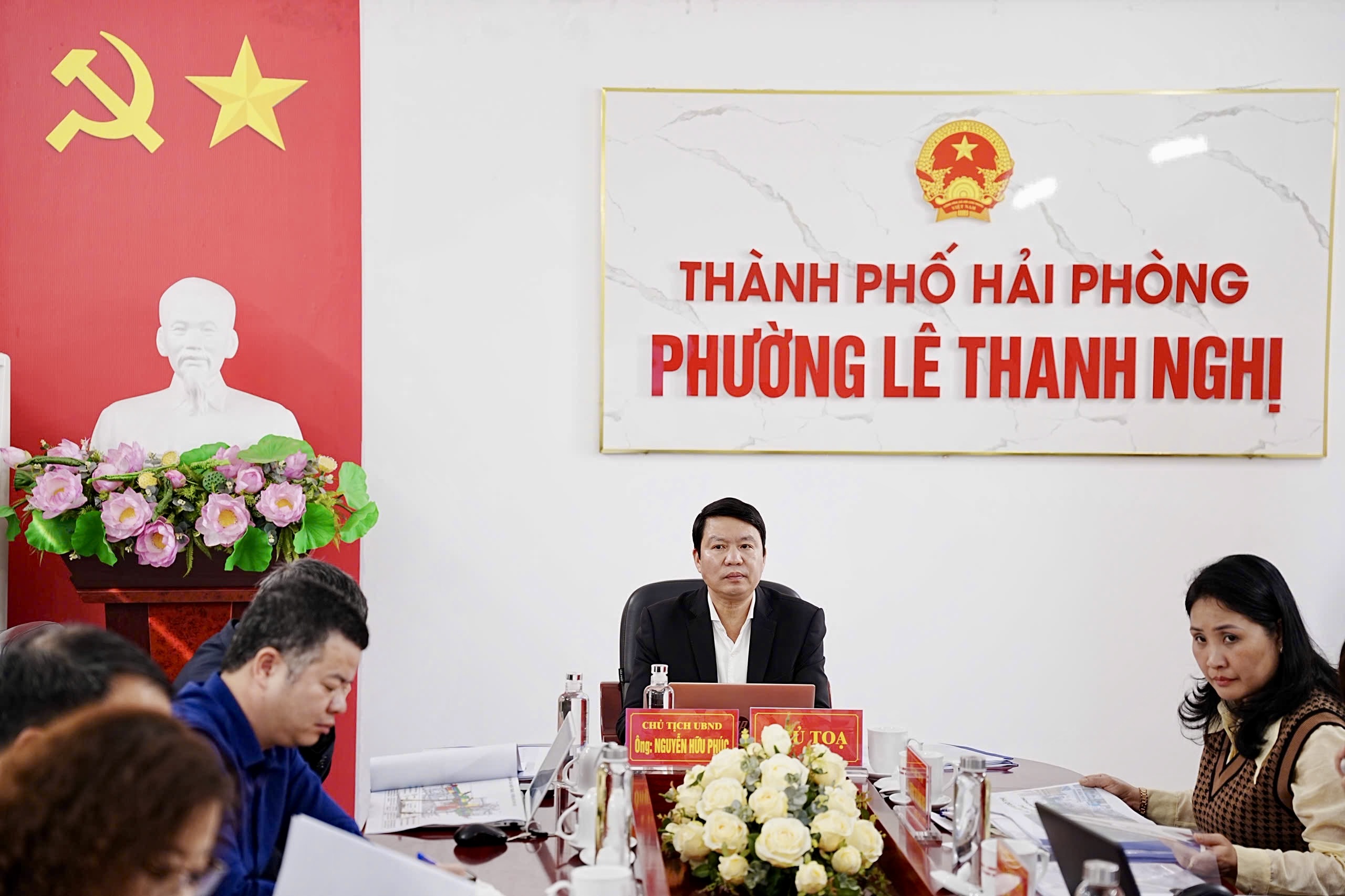 Chủ trì cuộc họp có đồng chí Nguyễn Hữu Phúc - Phó Bí thư Đảng ủy, Chủ tịch UBND phường; đồng chí Hoàng Minh Đức - Phó Chủ tịch Thường trực UBND phường; đồng chí Dương Thị Hằng Nga - Phó Chủ tịch UBND phường. Tham dự cuộc họp có lãnh đạo các phòng, ban chuyên môn thuộc UBND phường.